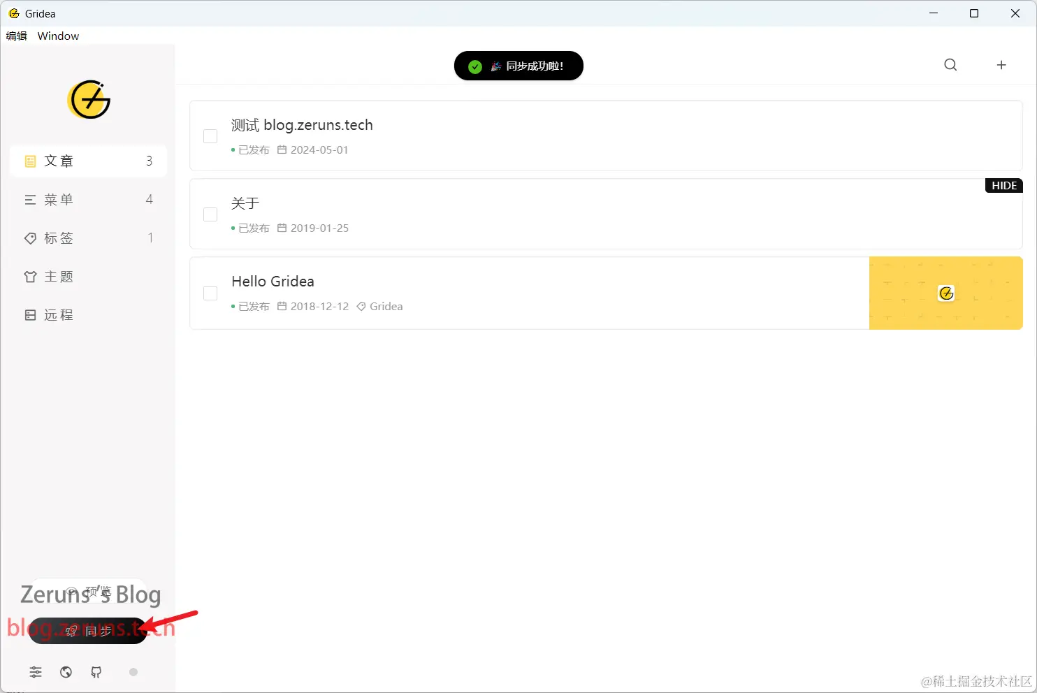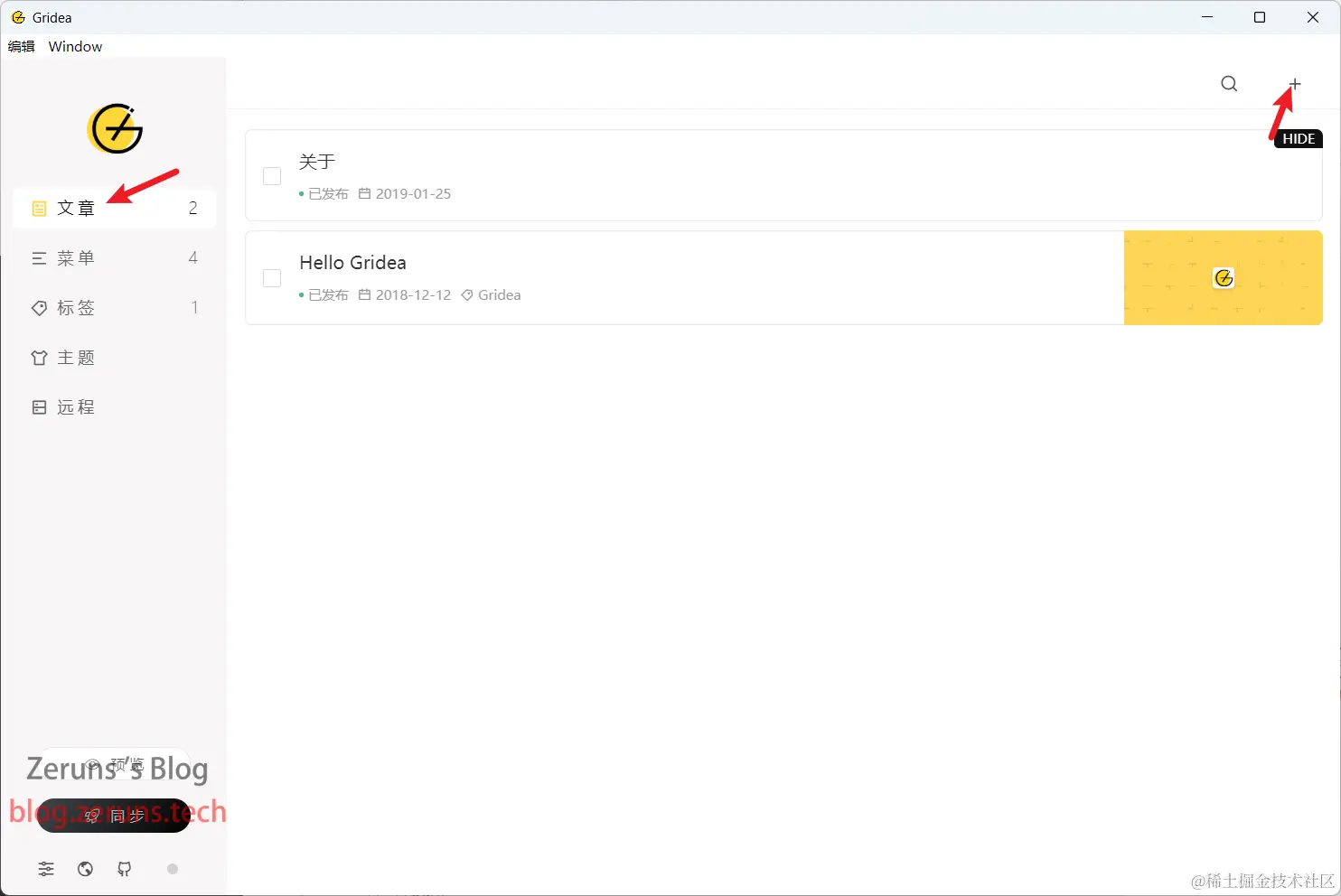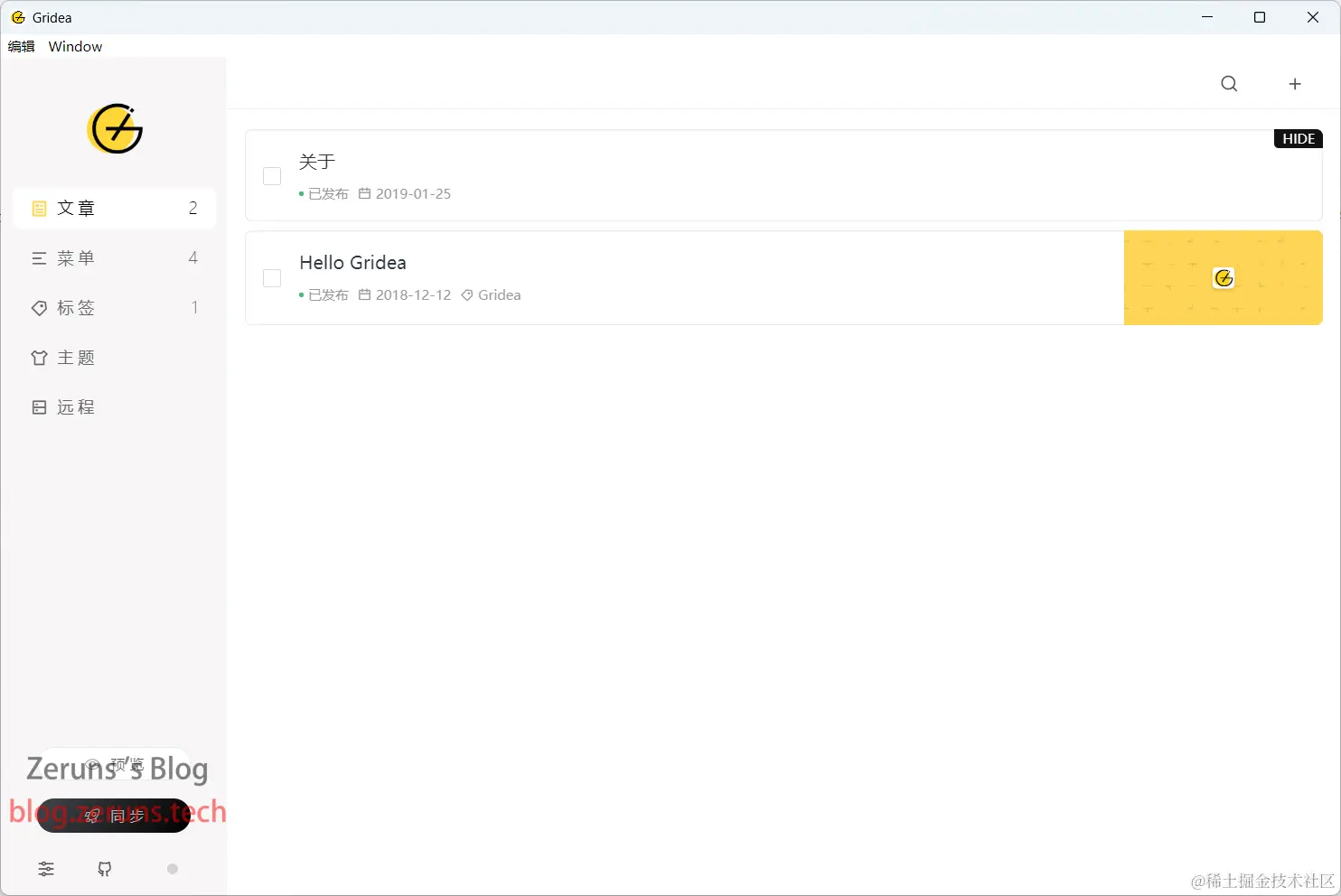 打开Gridea软件如下图所示,可以看到已经生成了两篇文章 关于 和 Hello Gridea ,左侧边栏还可以设置博客的菜单栏和标签,还可以换主题。