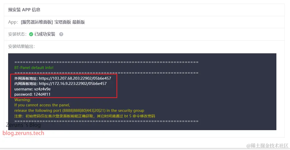 预安装APP安装完成后会在这里显示宝塔面板的后台地址和账号密码登信息,然后在浏览器地址栏输入这个地址就可以登陆面板了。