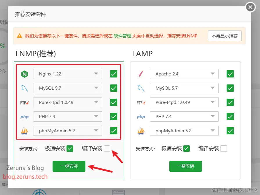 安装LNMP套件,选项一般默认即可,安装方式生产环境建议选择编译安装,但编译安装时间较长。