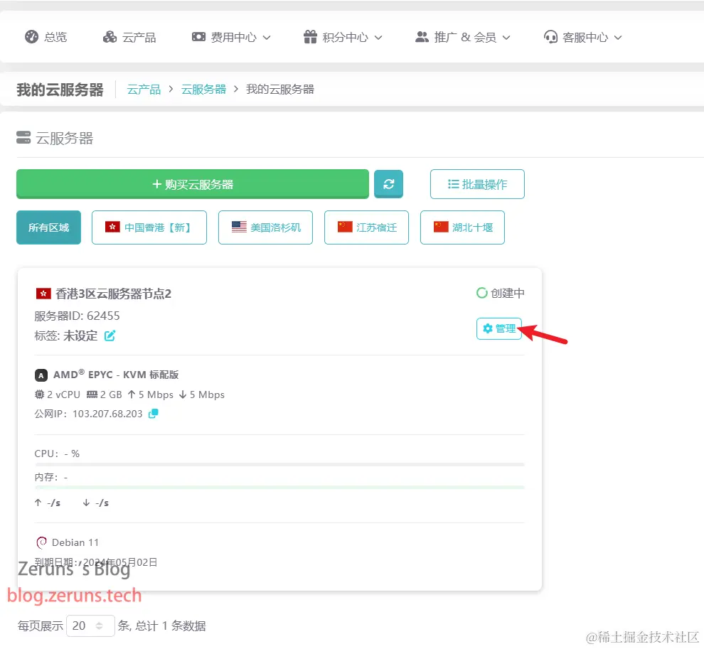 购买后即可在我的云服务器这里看到你买的云服务器,点击管理。