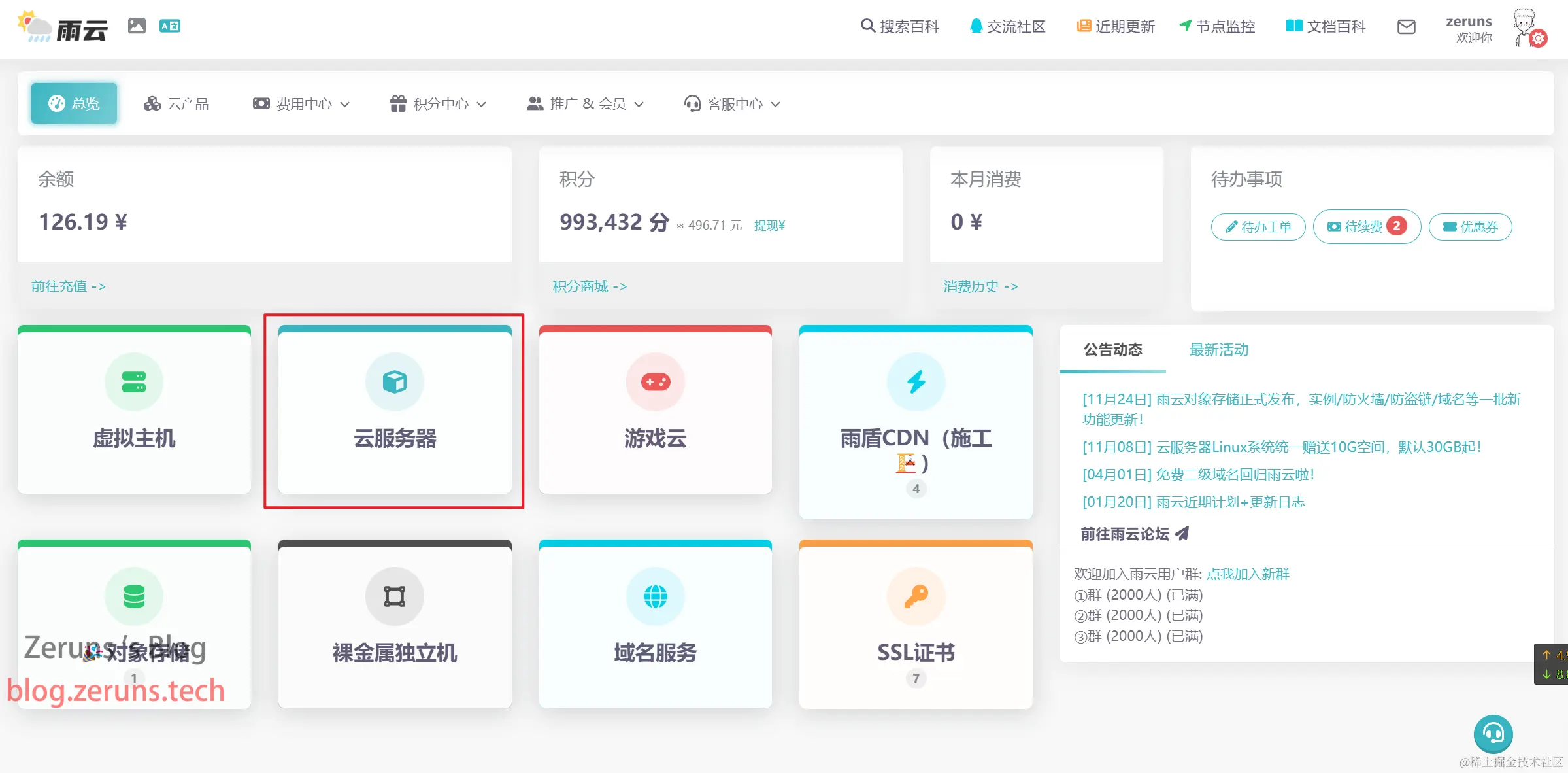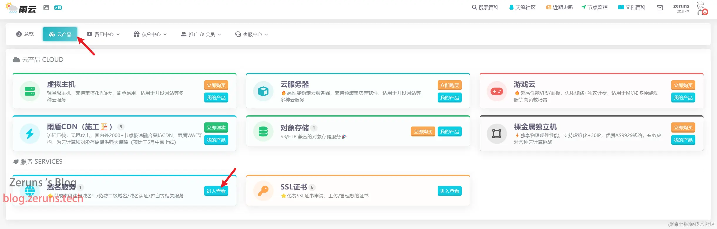 注册完账号后进到雨云控制台,云服务器入口可以在后台的 总览 和 云产品 部分找到:
