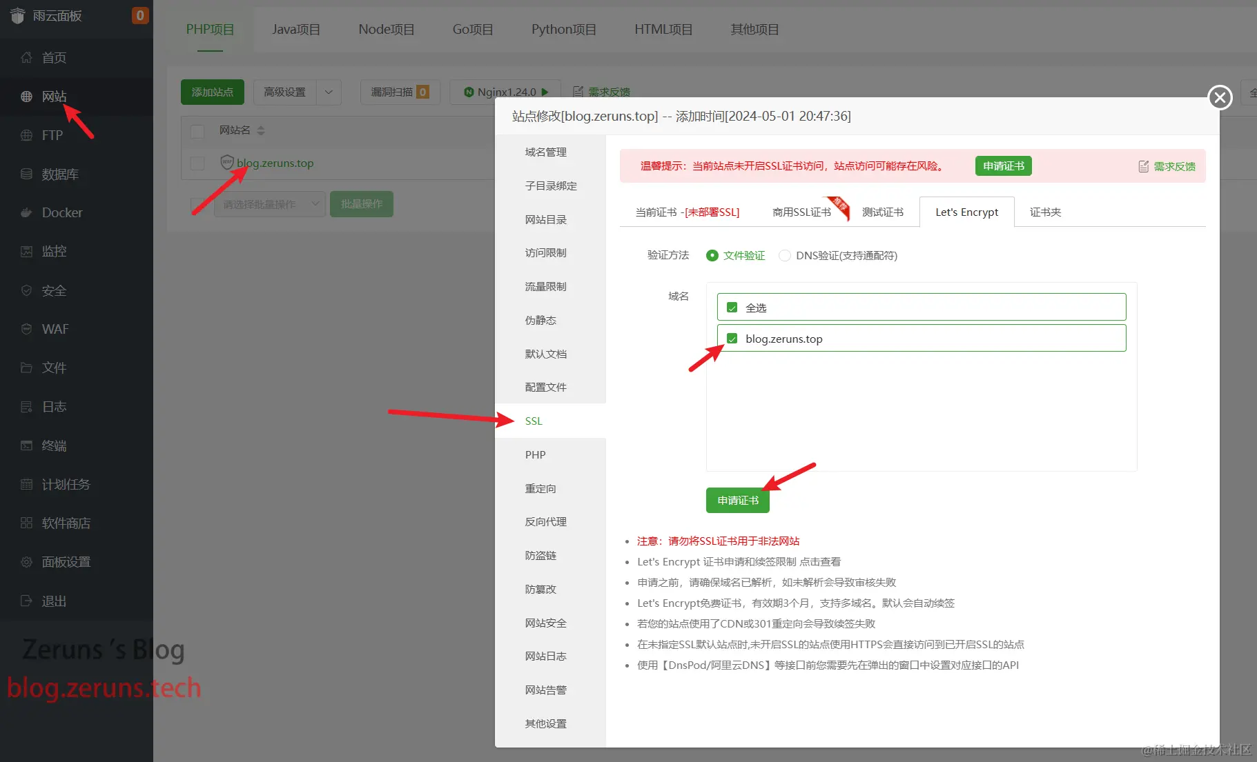 如下图所示,在宝塔面板中找到SSL证书申请,点击申请证书。