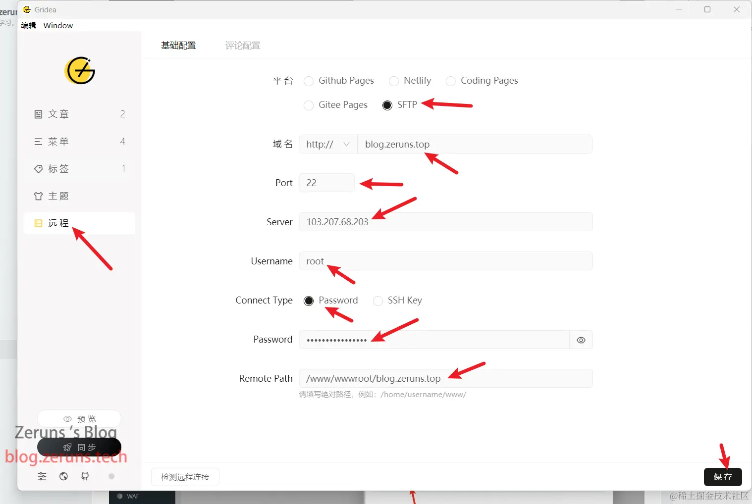 配置远程服务器,点击客户端左边的远程按钮,平台选择SFTP,域名输入你注册的域名,端口输入22,server填服务器的IP地址,Username和Password输入服务器的SSH用户名和密码,Remote Path输入刚刚创建的网站的目录,填好后点保存,然后点检测远程连接。