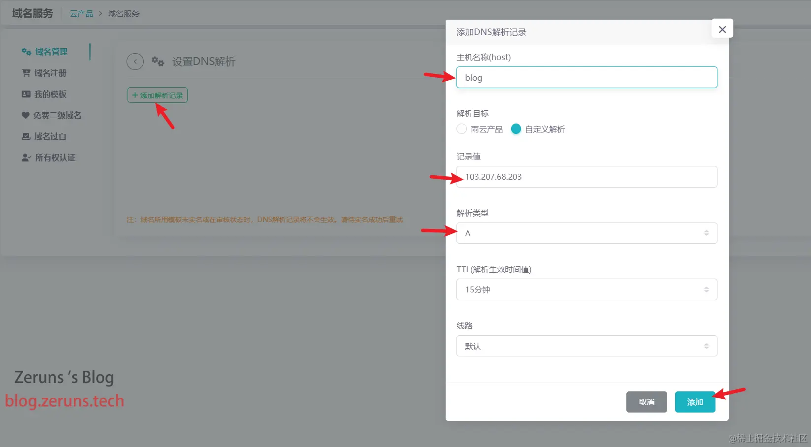 到域名解析控制台,添加记录,主机名称自己输入一个名字,比如输入blog,访问网站的时候就是blog.zeruns.top,输入@,访问网站就直接访问zeruns.top,记录值输入自己服务器的IP。