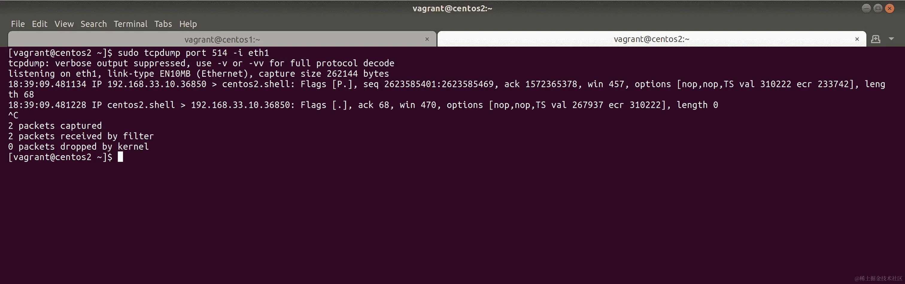 您可以通过在centos2上使用以下内容来测试您的配置: