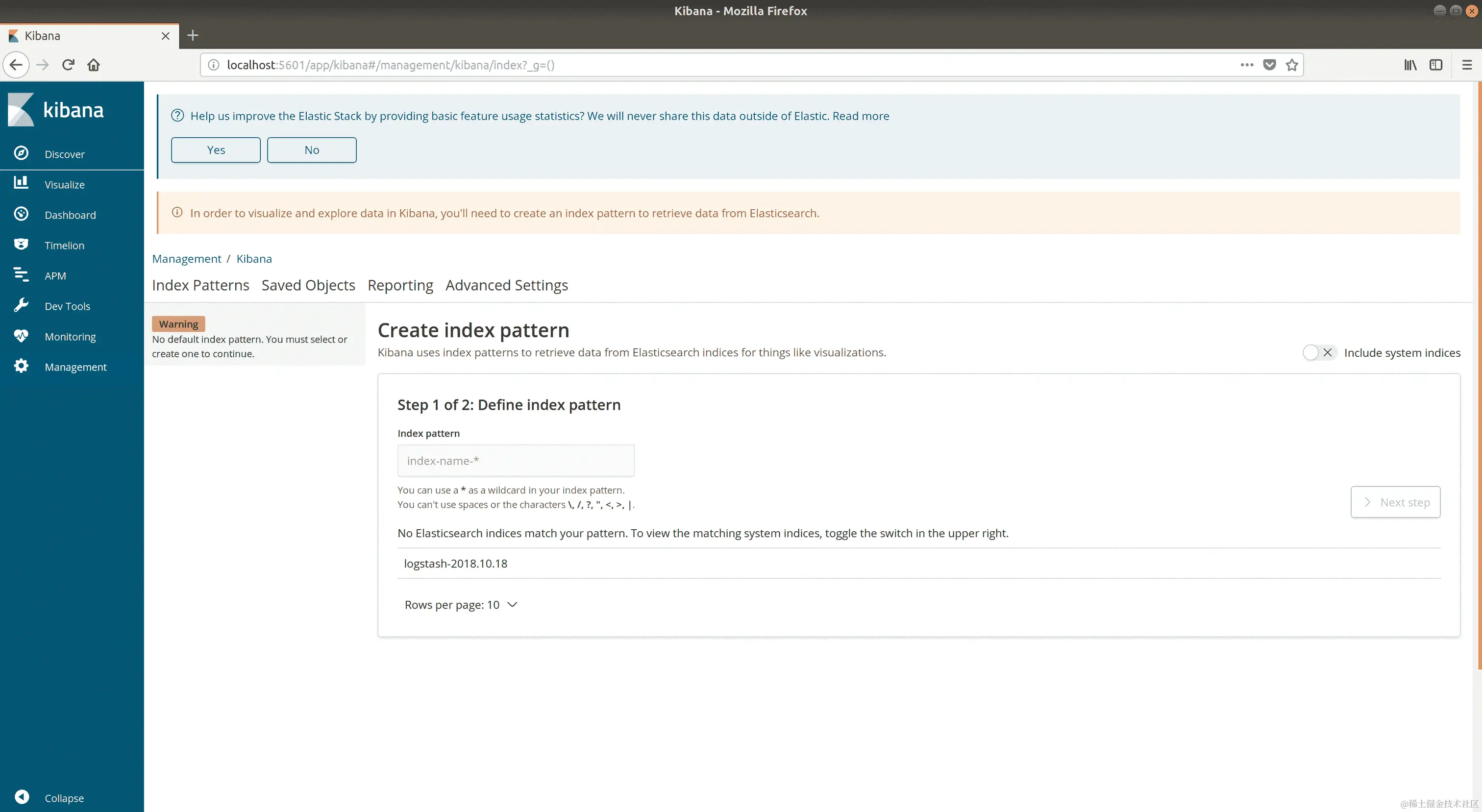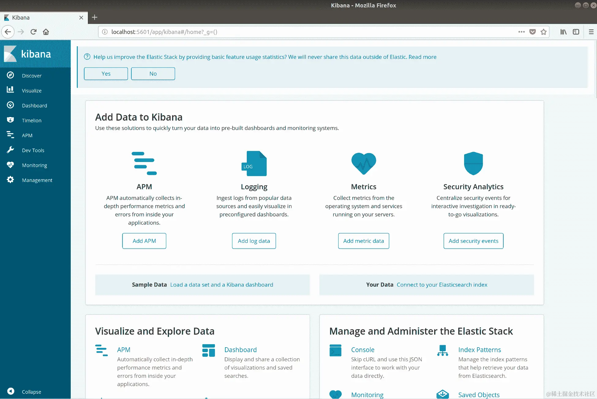 如果您以前使用过 Kibana,您可能期望点击 Discover 并查看您的日志,但实际上您会被踢到 Management: