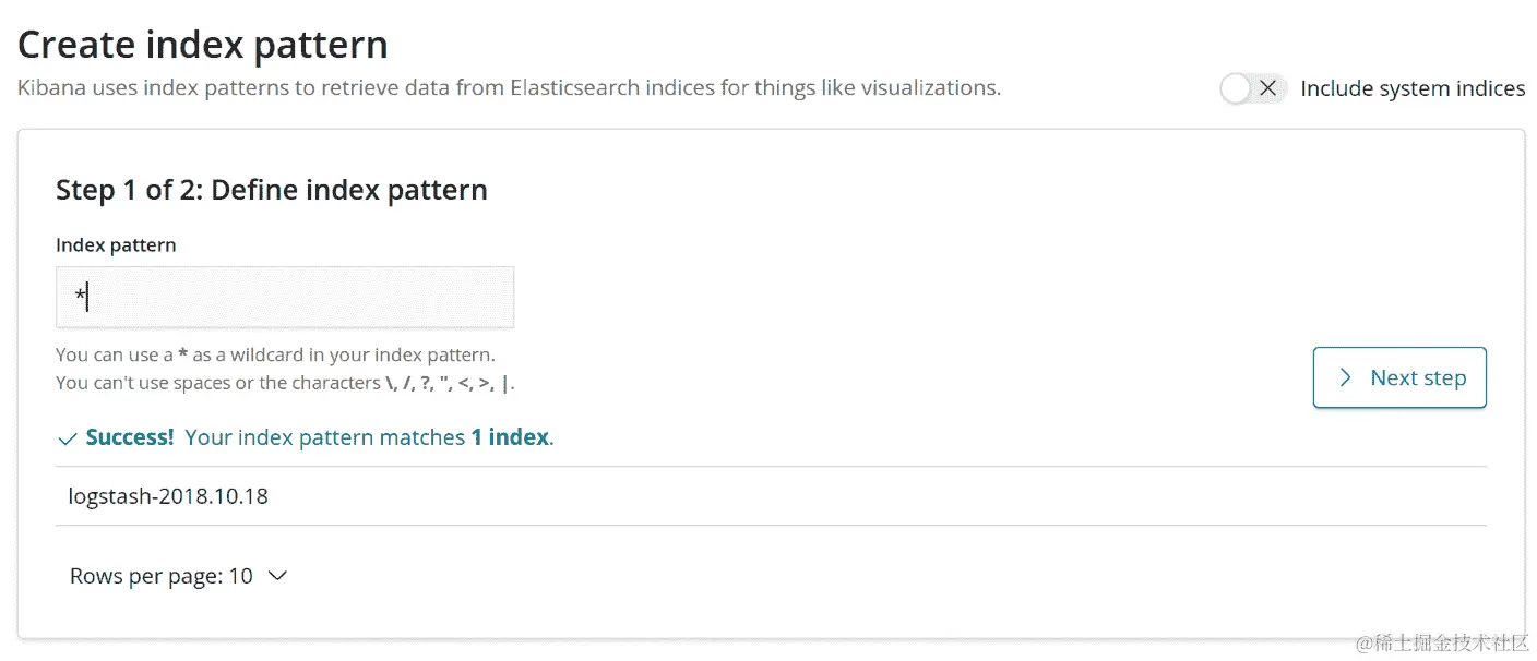 在索引模式的通配符条目中输入*,然后点击右侧的下一步: