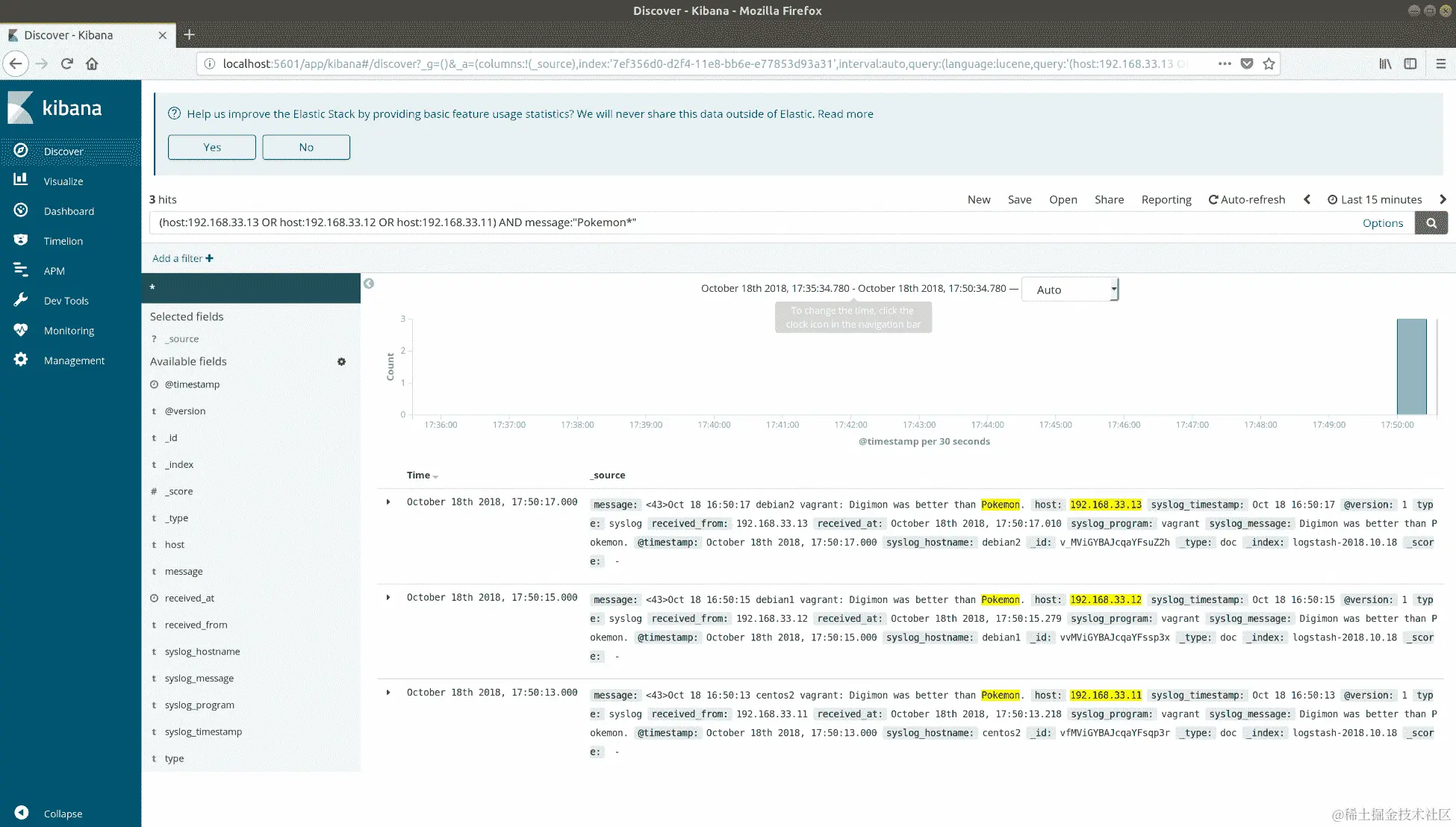 (host:192.168.33.13 OR host:192.168.33.12 OR host:192.168.33.11) AND message:"Pokemon*"