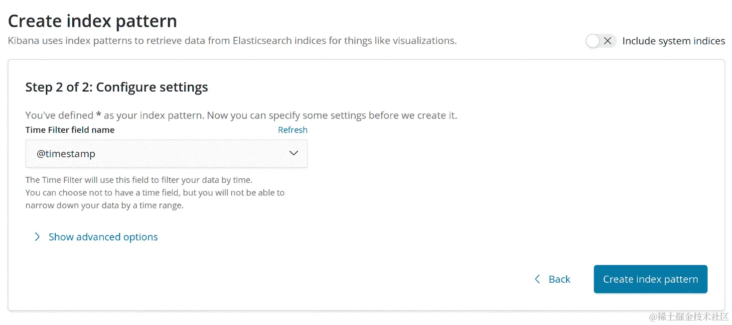 在下一部分,从提供的下拉列表中选择@timestamp,然后点击右侧的 Create index pattern: