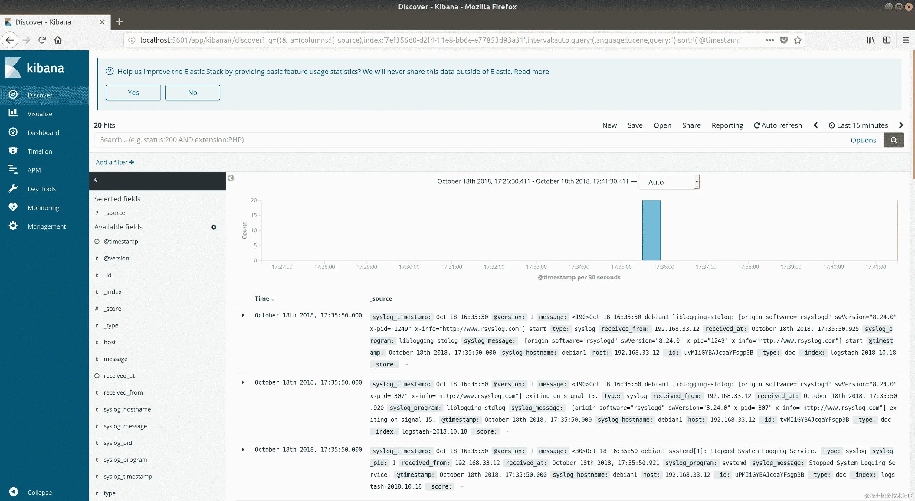 如果在 Kibana 中看不到数据,可能是因为 Logstash 在您从其他主机发送日志之前没有完全启动。尝试使用上面的logger命令再次发送您的日志。