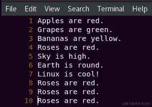 正如其名称所示,head命令显示文件的前几行。默认情况下,它显示文件的前十行。例如,我们知道facts.txt中有十行,因此运行head facts.txt命令将显示所有文件内容: