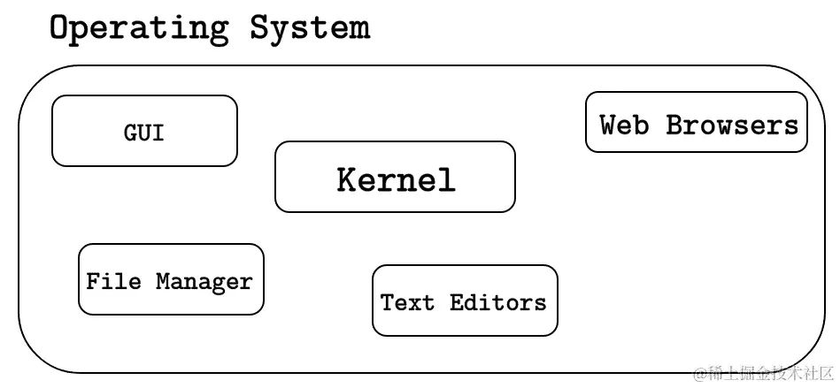 请注意,在定义中,我说内核是操作系统的一部分。下图可以帮助你形象地理解内核和操作系统之间的区别。