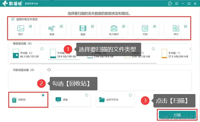 步骤1:安装软件后运行它,点击进入软件并选择需要扫描的文件类型和【回收站】后,点击 【扫描】;