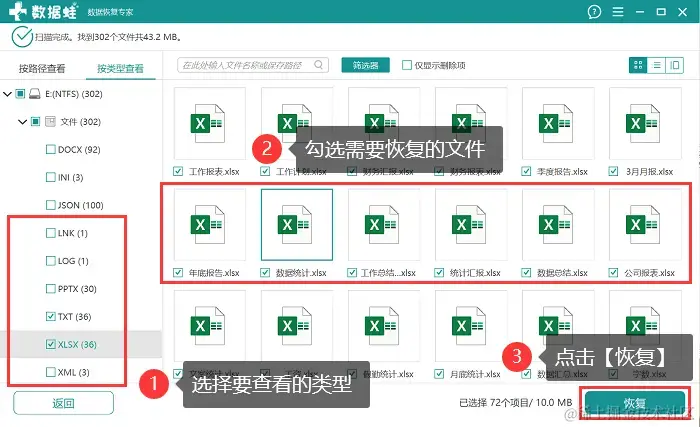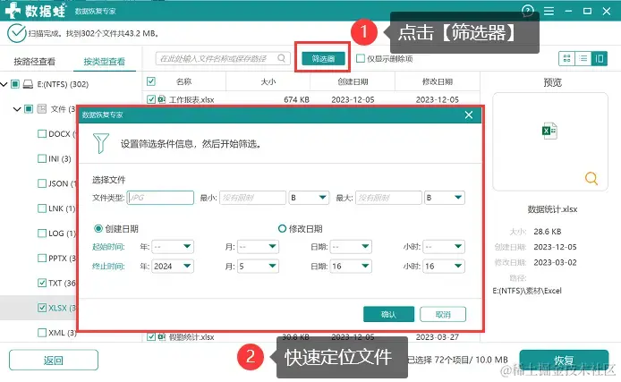 步骤2:扫描完成后,可以选择需要恢复的具体文件类型,在右侧可以对相应的文件进行查看和勾选,也可以直接进入【筛选器】中快速定位文件;