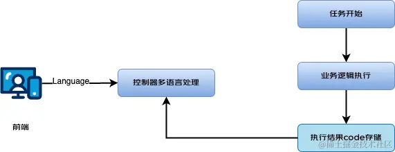 异步任务通常是内部逻辑,一般不会直接返回给客户,多数无须国际化,但一些特殊的场景也有给业务人员展示的情况,比如一些监控数据或者数据导入的失败原因,这种情况下,不可在后端数据库存储具体的语言。部分系统为了实现多语言,可能相同的词条数据库存储多套,根据前端的请求返回具体的语种,这种做法扩展性较差,后期新增语种会比较麻烦。解决这种问题办法类似于前面讲的前端国际化,统一存储错误code码,将多语言展示逻辑放在前端完成,在展示时根据当前的目标语言和错误码动态渲染。