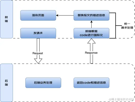 这个环节是前后端交互的主要环节,我们采用后端不进行国际化的模式,后端通过统一的业务code码和描述信息返回的形式。一个设计良好的系统,在交互过程中通常会直接将业务code码和描述信息返回并做展示,为此怎么做到最简单的改动达到最理想的国际化效果呢?在此推荐一个简单高效而后端无须国际化的方法。