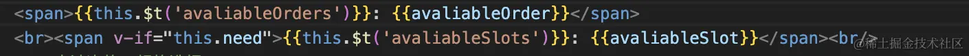 2. 文本文档替换:在开发过程中,将需要国际化的文本内容通过特定标识(如国际化键(key))引用,而不是直接嵌入到代码中。这样,无论应用程序在什么语言环境下运行,都可以通过这些标识找到对应的翻译文本,如下是前端VUE框架下的页面静态资源替换,需要将原来的中文文字替换成特定标识和第一步中的key形式,比如:{{this.$t('avaliableOrders')}}。这部分工作通常是和第一步工作同时进行的,现有词条提取组件可以帮完成这些静态资源的替换,但是前后端的交互部分通常需要开发者进行特别处理。
