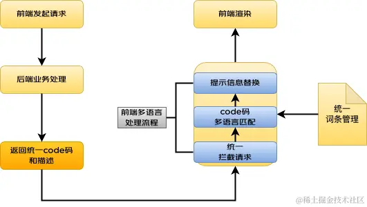 方案的要点在于前端对于调用请求进行统一的封装收口并拦截处理,会在所有的请求返回后对返回报文中要展示的信息通过code码获取本地的多语言结果,替换后端的多语言结果,这样在系统进行国际化的时候,前端可以做到较小的交互改动达到理想的国际化结果。