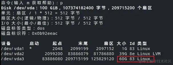 3) 输入 p,查看当前分区,可以看到已经新建了一个 60G 的分区;输入 w,回车,保存磁盘信息。