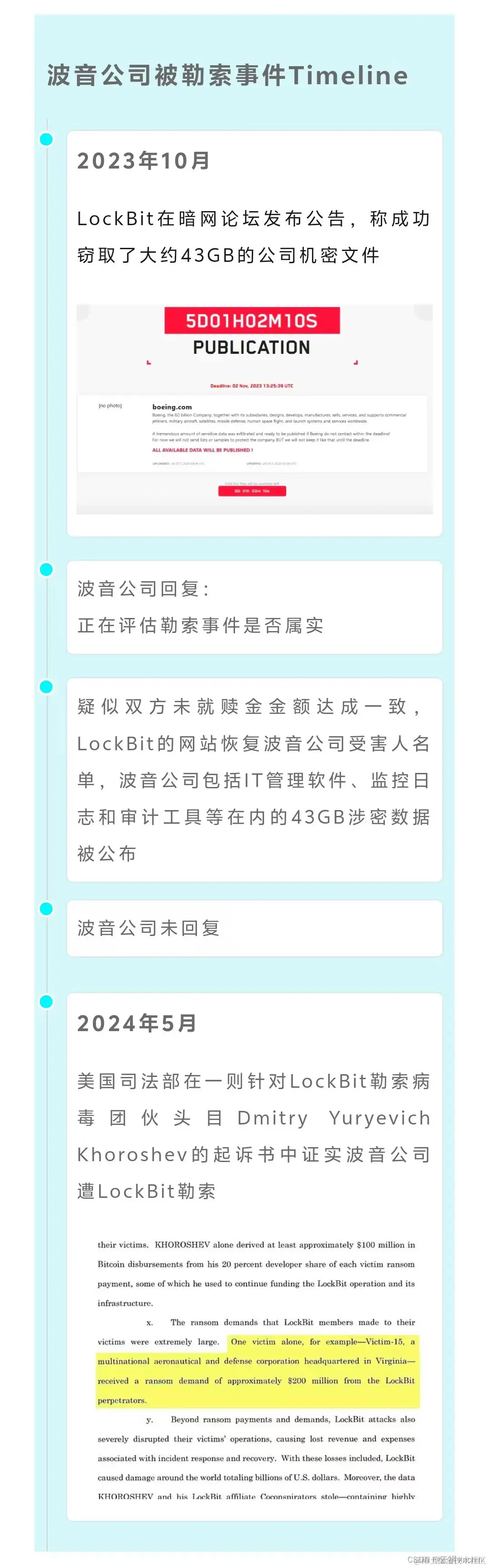 去年10月,LockBit向美国波音公司发起勒索攻击,勒索金额高达2亿美元。拒付赎金后,波音公司43GB涉密数据遭到泄露。