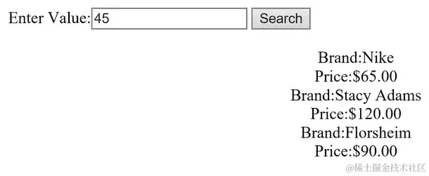 现在再次打开浏览器,输入一个值,比如45,然后点击搜索按钮。它应该返回所有的鞋子,因为价格都高于这个值,如图 29.3.6所示: