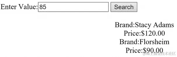 让我们再做一个。再输入85,然后再次点击搜索按钮。如图 29.3.8所示,它返回 Stacy Adams 和 Florsheim 鞋子,因为这两者的价格都在 85 美元或以上: