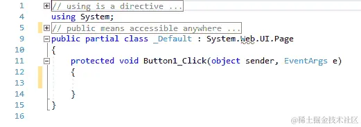 接下来,转到设计视图。双击保存文件按钮。这会打开Default.aspx.cs中的事件处理程序。删除Page_Load存根。折叠using System;上下的所有注释—你不需要它们。该项目起始代码的相关部分应该看起来像图 28.2.1中的那样: