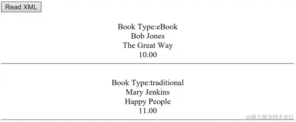 现在让我们在这里试一下,在浏览器中打开它。记住,你实际上是在将 XML 读入网页。这是我们的目标。点击“读取 XML”按钮。结果显示在图 27*.1.3*中:
