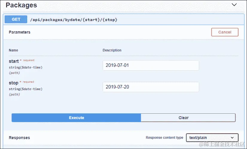 Route属性声明了我们服务的基本路径将是api/packages。我们实现的唯一操作方法是GetPackagesByDate,它在HttpGet请求的路径上调用bydate/{start}/{stop}类型的路径,其中start和stop是作为输入传递给GetPackagesByDate的DateTime参数。ProduceResponseType属性声明如下: