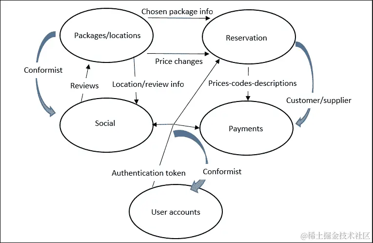 每个有界上下文的客户实体之间存在关系,而套餐处理有界上下文的购买实体与支付相关。确定在各个有界上下文中映射到彼此的实体是正式定义代表上下文之间所有可能通信的接口的第一步。