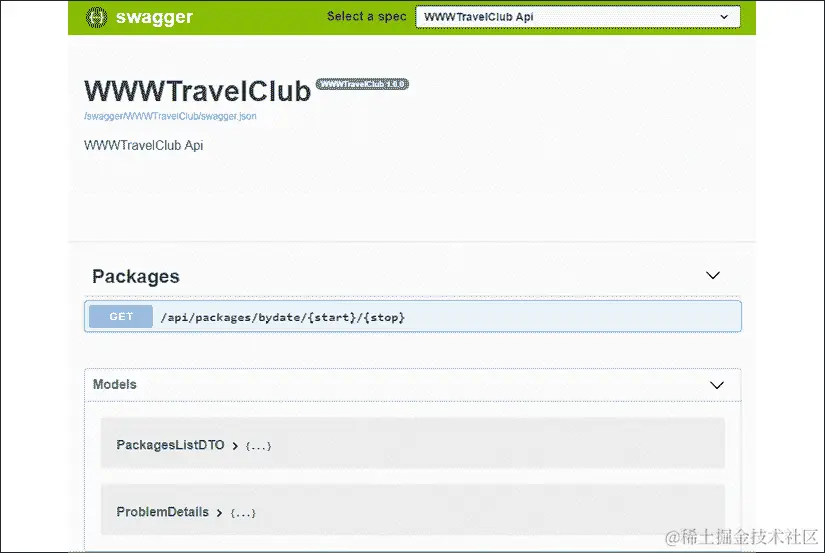 PackagesListDTO是我们定义的用于列出包的模型,而ProblemDetails是在发生坏请求时用于报告错误的模型。通过单击GET按钮,我们可以获取有关我们的GET方法的更多详细信息,并且还可以测试它,如下面的屏幕截图所示: