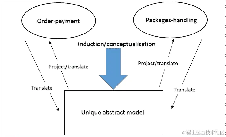 在这里,我们摆脱了繁琐的唯一抽象模型,但现在我们有几个分离的模型,我们需要以某种方式进行关联。DDD 建议将处理所有这些分离的模型,即所有有界上下文,如下所示: