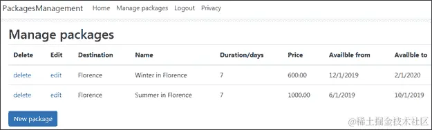 查询对象通过 DI 注入到操作方法中。然后,操作方法调用它,并将结果的IEnumerable插入到PackagesListViewModel实例的Items属性中。将IEnumerables包含在 ViewModels 中是一个很好的做法,而不是直接将它们传递给视图,这样如果需要,可以添加其他属性,而无需修改现有的视图代码。结果显示在 Bootstrap 4 表中,因为 Visual Studio 自动创建了 Bootstrap 4 CSS。