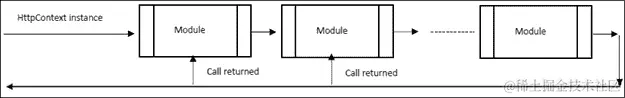通常,每个模块处理由管道中前一个模块传递的HttpContext实例,然后调用await _next.Invoke(context)来调用管道中其余模块。当其他模块完成其处理并为客户端准备好响应时,每个模块可以在_next.Invoke(context)调用后的代码中执行进一步的响应后处理。