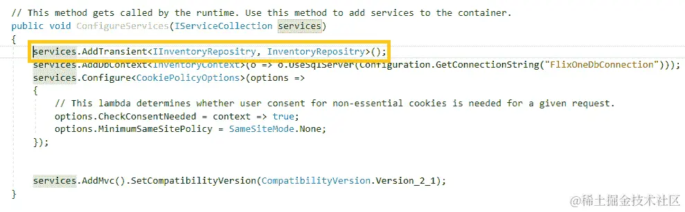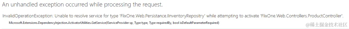 要解决此异常,您应该在Startup.cs文件中映射到IInventoryRepository,如下截图所示: