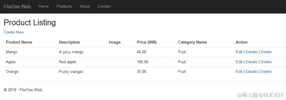 在我们的情况下,每当用户请求/Product时,请求会传递到ProductController的Index操作方法,并在获取产品列表后提供Index.cshtml视图。您将会得到如下截图所示的产品列表: