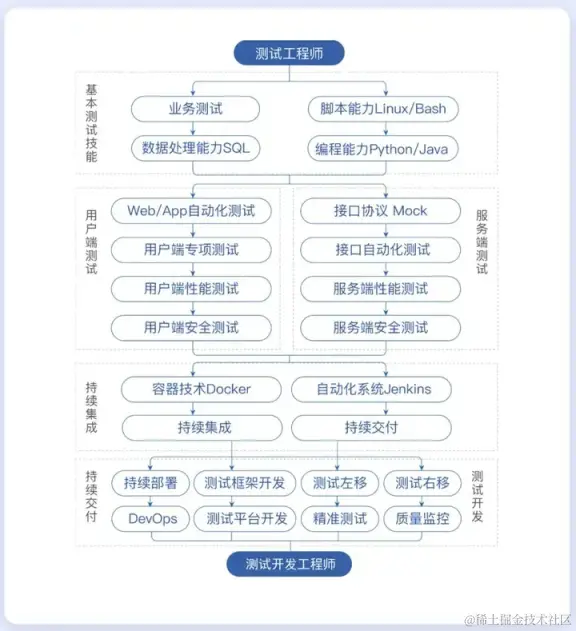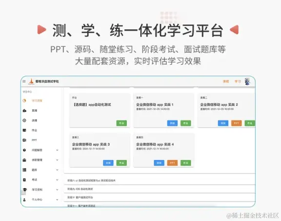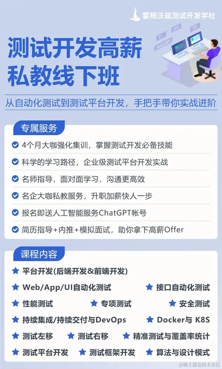 测试开发进阶课内容:平台开发、Web/App/UI 自动化测试、接口自动化测试、性能测试、专项测试、安全测试、持续集成/持续交付与 DevOps、测试左移、测试右移、精准测试与覆盖率统计、测试平台开发、测试框架开发、算法与设计模式等内容。