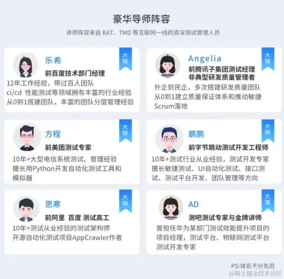 为了帮助更多的测试工程师获得这种职业优势,我们制定了一个为期 4 个月的成长计划,从测试开发技术能力、沟通表达能力、学习能力、思考力、认知升级等几个维度,借助线下授课、小班私教、案例拆解等模式,全面提升你的职业素养。