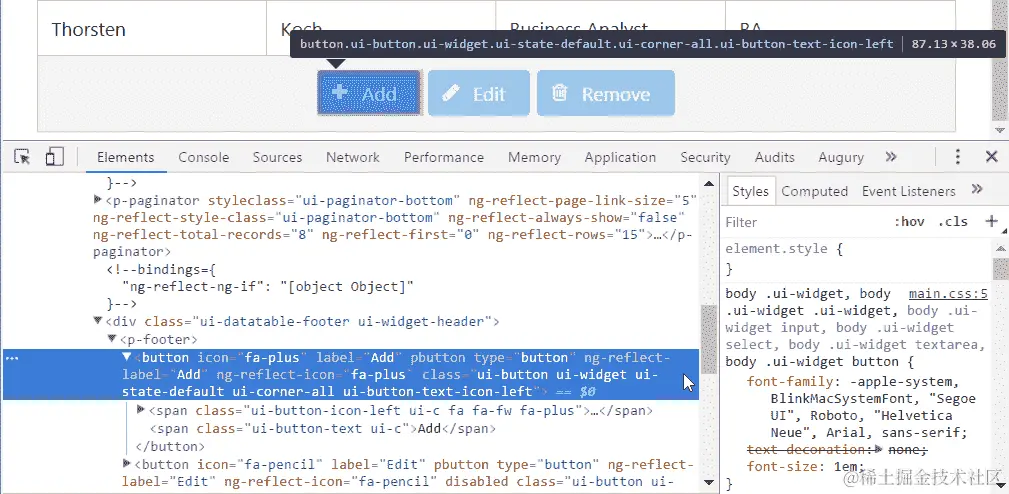 让我们看看如何使用公开的 DebugElement 的公共方法。首先,我们需要在 DevTools 中选择一个 DOM 元素。这将在变量 $0 中保留对所选 DOM 节点的引用,然后可以从控制台中访问。在 CRUD 应用程序中,我们将选择“添加”按钮,如下截图所示: