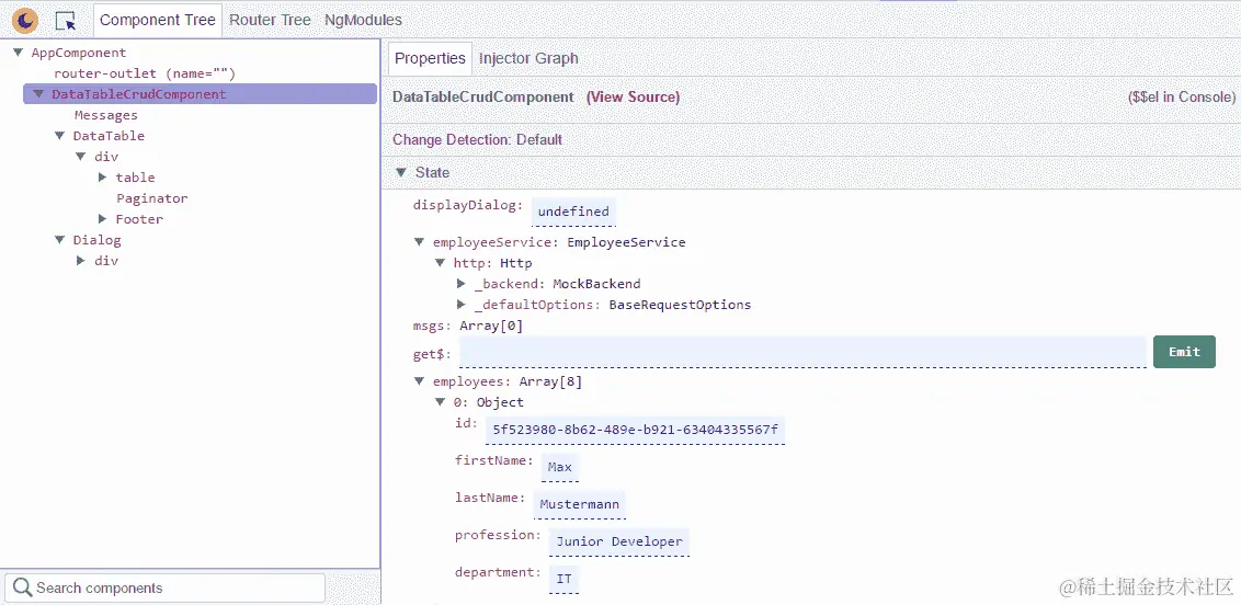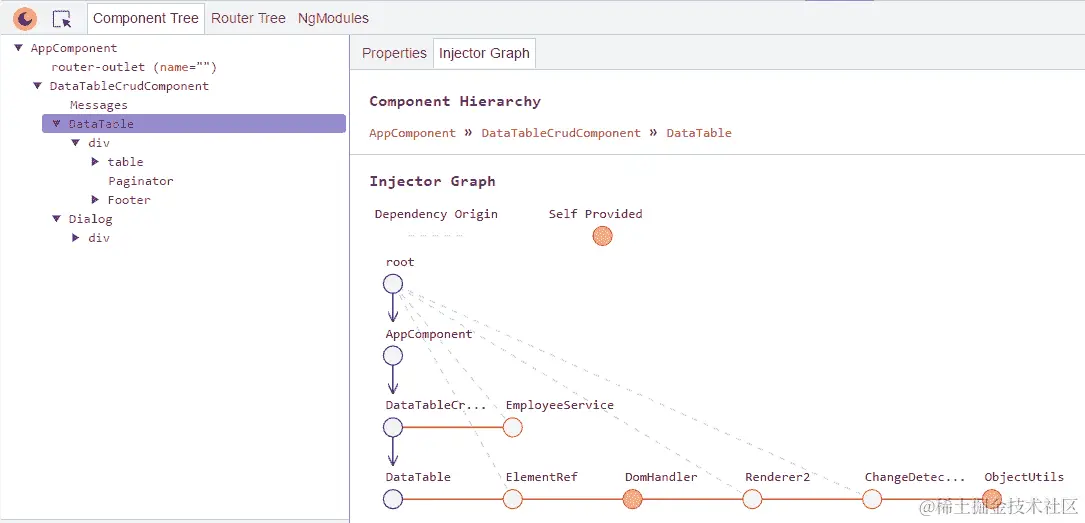 在属性选项卡旁边是注射器图,显示了组件和服务的依赖关系。如果我们选择 DataTable 组件,则将显示 DataTable 的依赖关系及其祖先链到根注射器: