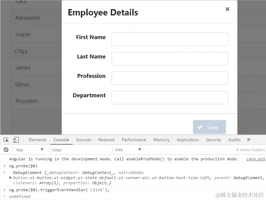 有一个问题——所解释的代码没有改变 UI。原因很明显——我们需要手动调用变更检测器。下一行有点复杂,但确实做到了我们需要的事情——运行变更检测周期。结果,员工表变为空: