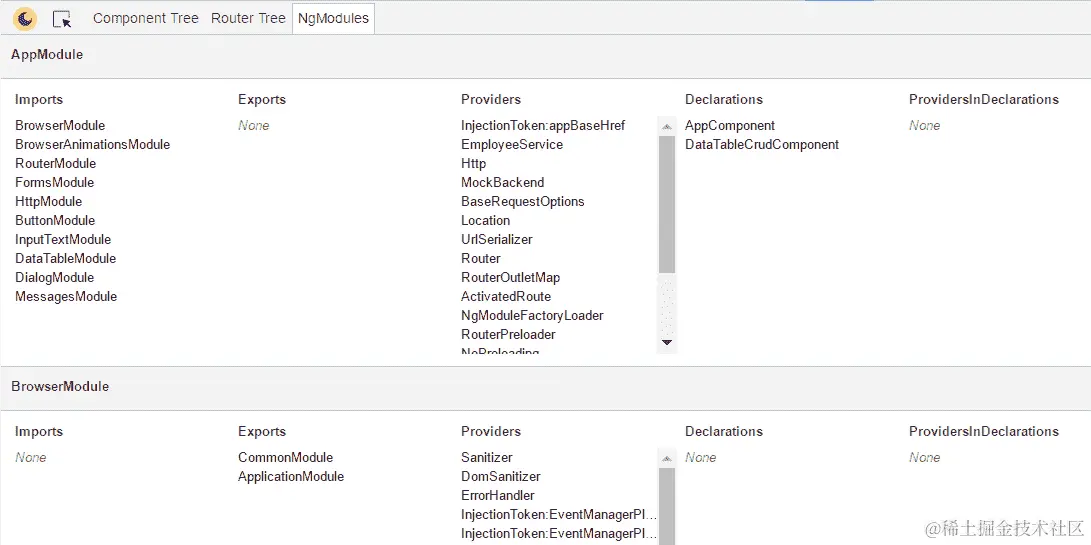 路由器树为您提供了应用程序中所有路由的树状视图。您可以探索哪些路由来自应用程序的哪些部分。我们将跳过适当的截图。下一个选项卡 NgModules 列出了应用程序中的所有模块,以及模块的导入、导出、提供者和声明。对 NgModules 的了解可以了解可用模块的复杂性和大小: