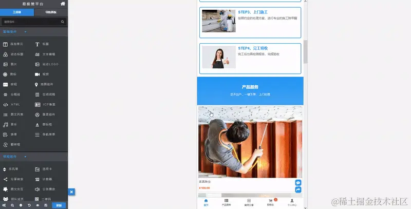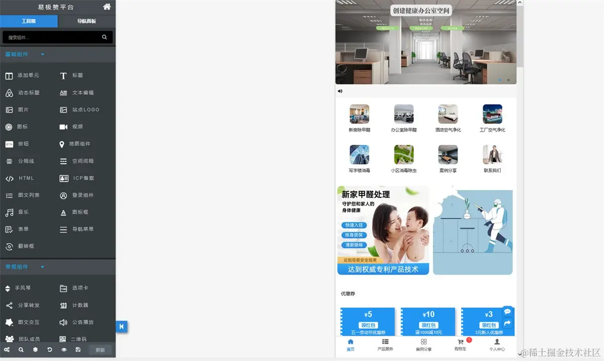 step2, 一键生成除甲醛服务小程序,进入可视化编辑器可以对站点文案图片进行修改