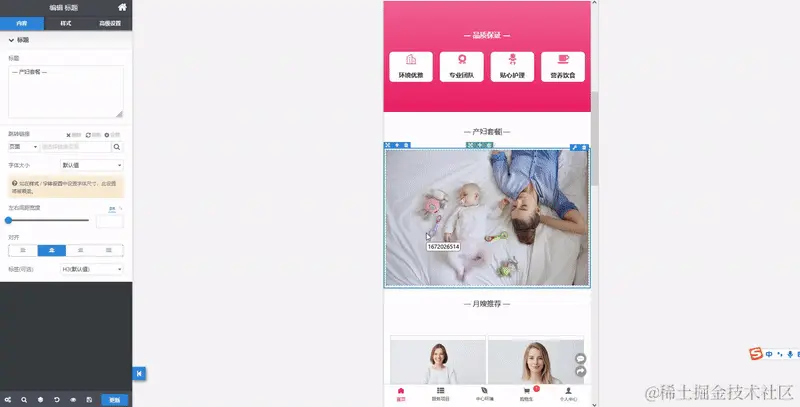 step2, 一键生成月子中心小程序,进入可视化编辑器可以对站点文案图片进行修改