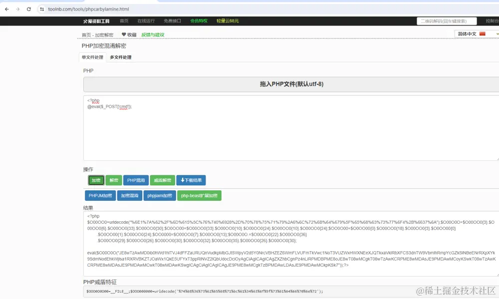 这里就是用的就是在线混淆php代码的方式直接过了目标主机上的杀软。