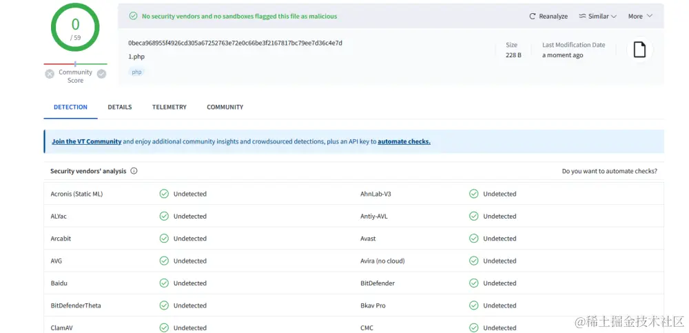 这里中途又替换了几个github上的免杀木马,均无效。ps:我是懒狗,免杀什么的能不写代码就不写代码。php这玩意有个好处,就是语法特别脏,各种免杀手法层出不穷,花里胡哨。这里就简单的介绍几种比较偷懒的方法。
