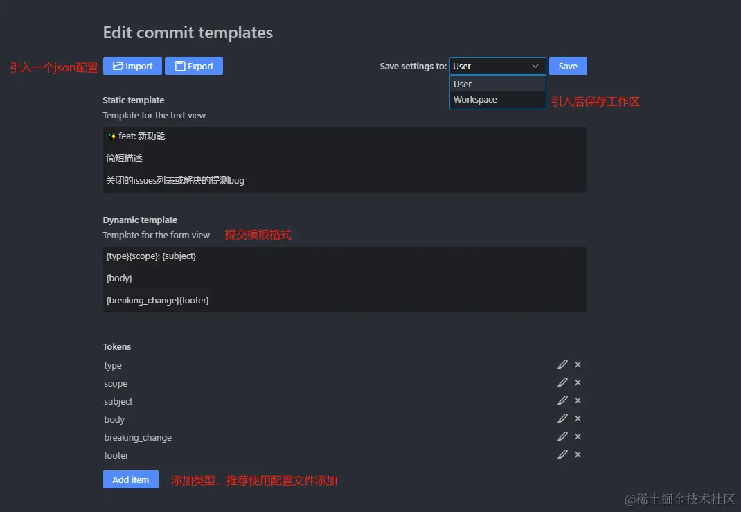 可以先点击导出配置文件,然后修改配置文件后再次导入,并保存至工作区,这样一份属于自己的commit配置就生成好了。