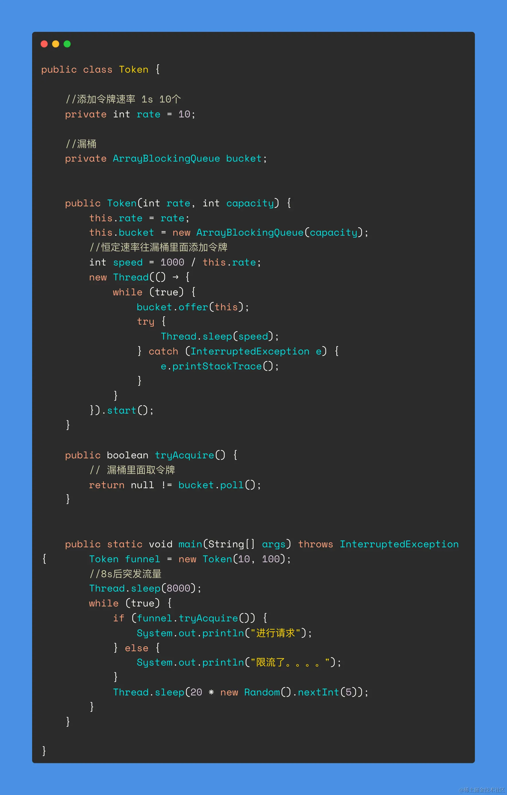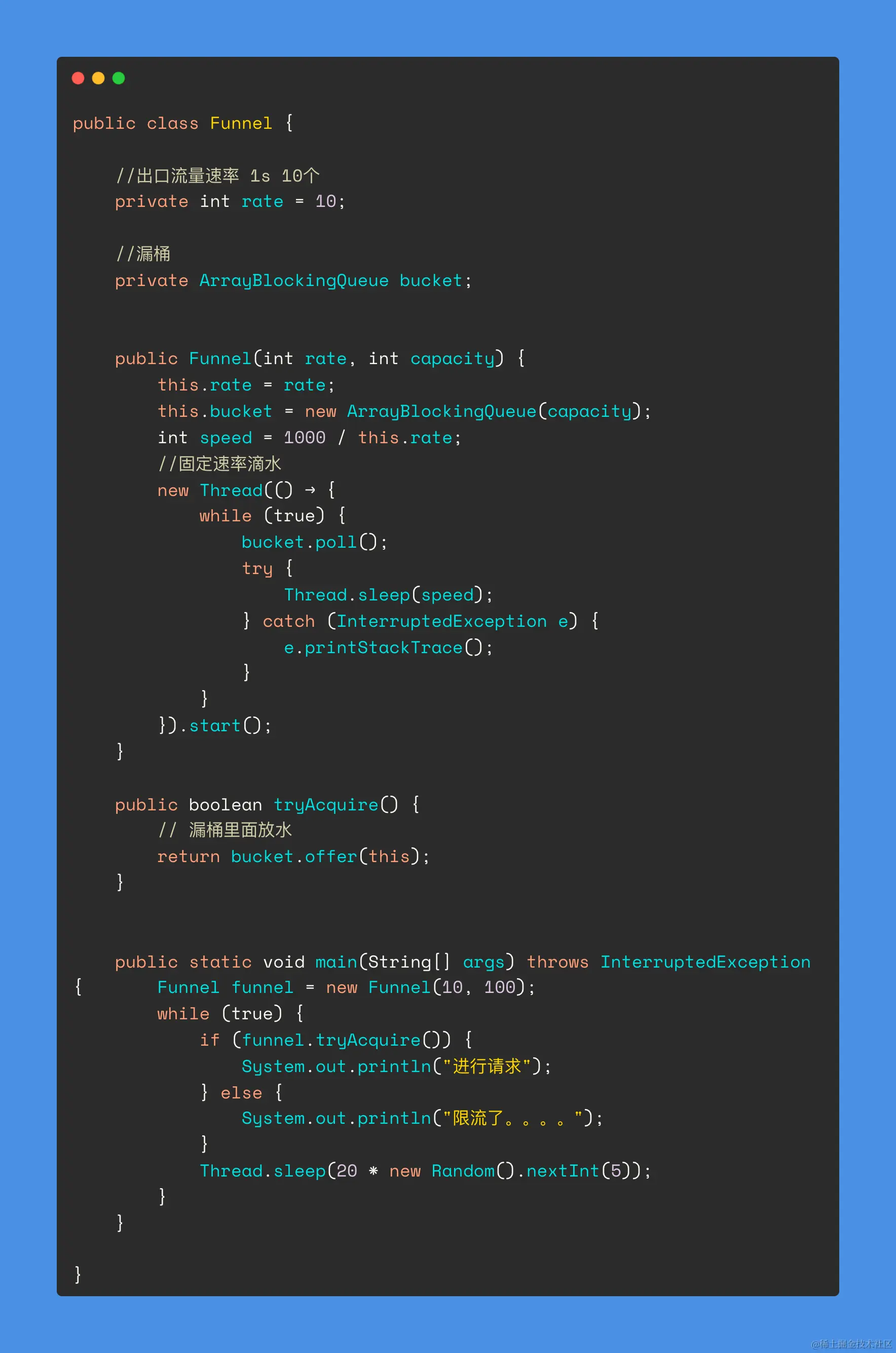 这里我用了 ArrayBlockingQueue 作为漏桶,可以快速的实现功能。