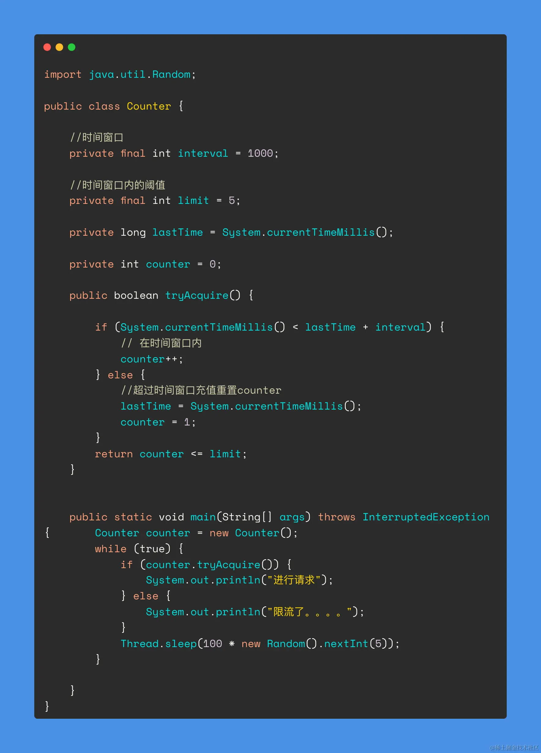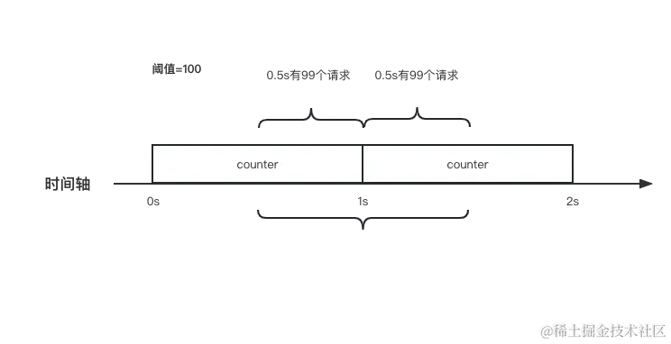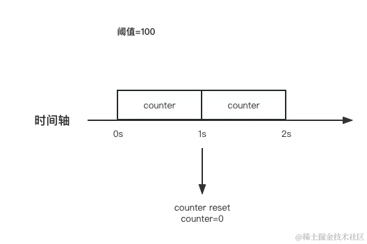 如下图,在0~1s内,如果counter>=100,那么在这个时间内就不会再接受新的请求,一直到1s后将counter进行重置。