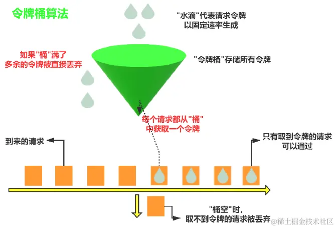 最开始,令牌桶是空的,我们以恒定速率往令牌桶里加入令牌,当桶被装满时,多余的令牌会被丢弃。